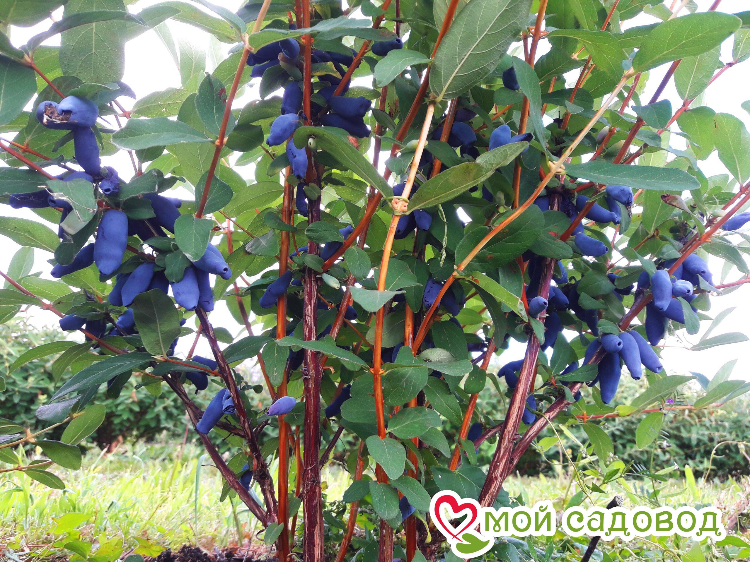 Жимолость Медовая ягода — сорт можно смело отнести к раннеспелому. Первые ягоды появляются уже в июле. Плоды продолговатые, цилиндрические, массой 0,8-1,1 гр. Плодоножка длинная, у спелых ягод отделяется легко. Сам куст среднерослый, раскидистый, требующий простора. Форма кроны округлая. Если делать регулярную обрезку куста (раз в 2-3 года), то это приведет к значительному увеличению урожая и продлит жизнь растению.